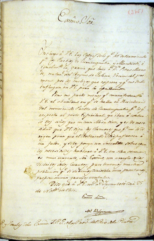 Capitán Juan Francisco Arias, fechado en Caá Guazú el 23 de Noviembre de 1810,
