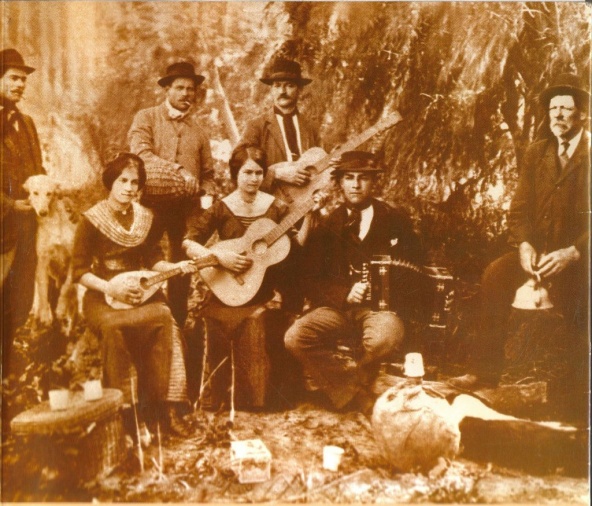 FAMILIA DE MÚSICOS - la de Cirilo Paoli. El lugar es la chacra "Trentina", donde habitaban, en las cercanías de la Ciudad de General Acha, año 1914. (Tapa libro "Folklore y Música Popular en La Pampa" de Rubén R. L. Evangelista, segunda edición 2009)
