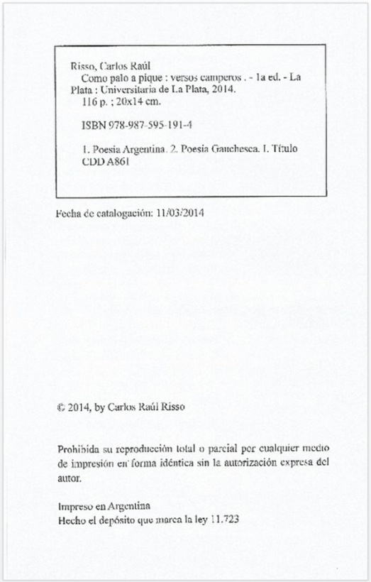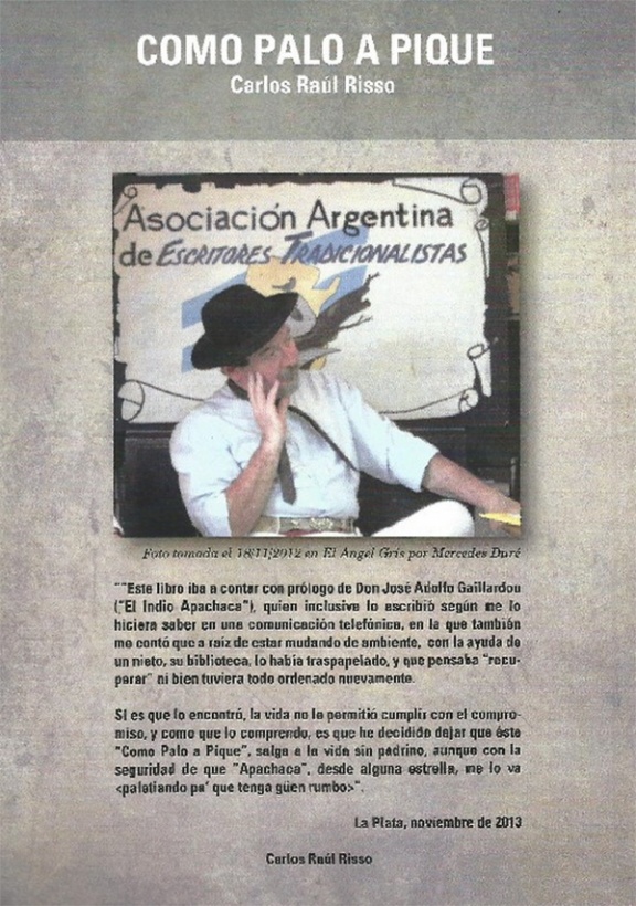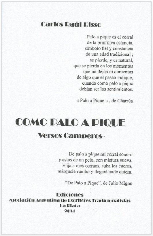 Como el mismo lo dice en la página 8 del libro que aquí comento: "Como Palo a Pique" se divide en cinco partes, partes que no tienen otra pretensión que la de agrupar los compuestos -medianamente- por contenido, las que se titulan: "A lo crioyo", porque hay tareas, actitudes, actividades que hacen a lo campero; "Cavilando", porque nuclea pensamientos y reflexiones; "Crudezas", porque dice de cuestiones duras de la vida; "Danzas", porque agrupa cuatro temas con formato de huella, danza pampeana; y "Del Chasque", sección ésta reservada exclusivamente a las cartas en verso que escribiera entre el 28/3/1992 y el 6/1/1996.