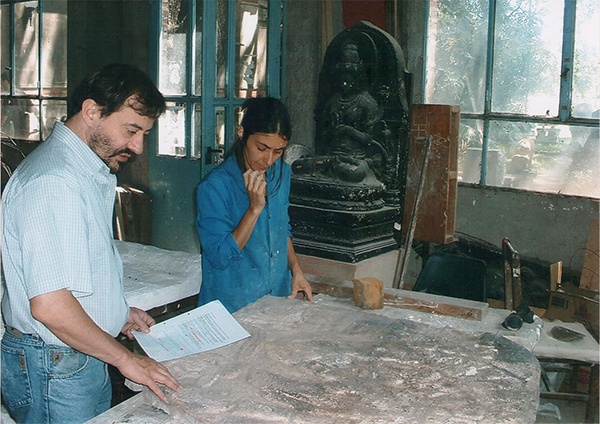 El autor junto a la profesora Marisa Coniglio, observando un fragmento de yeso perteneciente a la réplica de una estela de Monte Albán, en el taller de restauración del Museo Universitario de Arte Ernesto de la Cárcova.