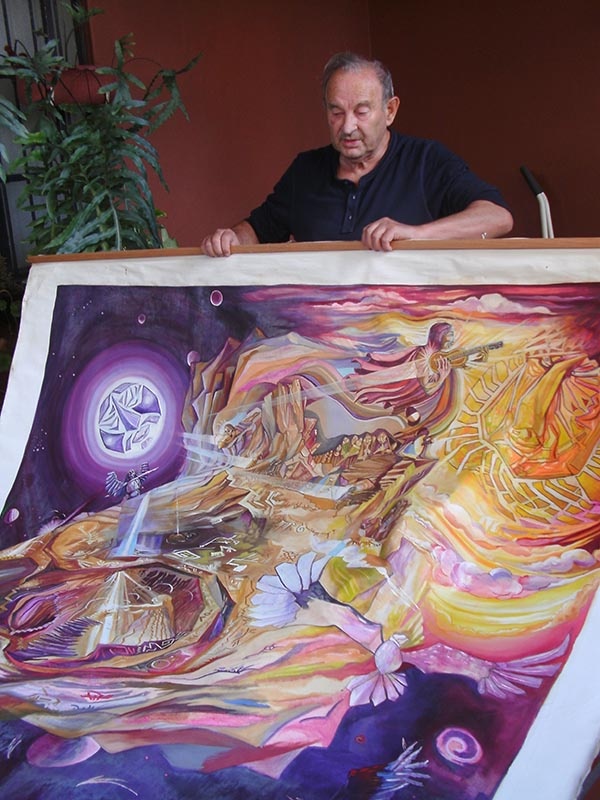 Cornide desplegando el mural ( 2 por 2 metros) "El nacimiento del charango"