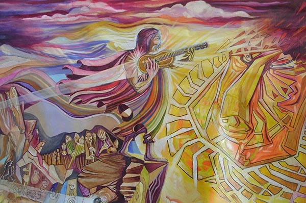Detalle del mural "El nacimiento del charango". El niño que levantó al kirkincho/charango es Jaime Torres