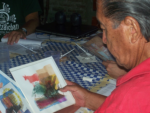 Gallegos Quispe observando dibujos que fueron utilizados en la realización de la película "Hombre bebiendo luz", de Jorge Falcone