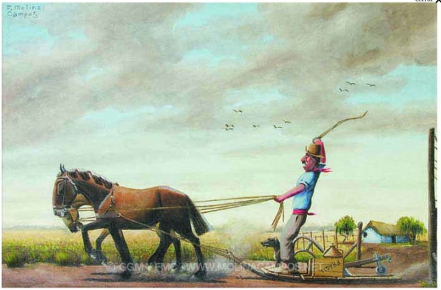 Molina Campos no pintó patrones: sus personajes son gente de trabajo más o menos ricos, sin protagonismos políticos. Son seres anónimos aunque tengan nombres: Celesto Aguilera no deja de ser un capataz, ni Tiléforo Areco un resero. Son sus oficios los que los definen.