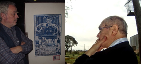 Pedro Hasperue y sus grabados y Miguel Praino, fotografiado por Azul Cedrón.
