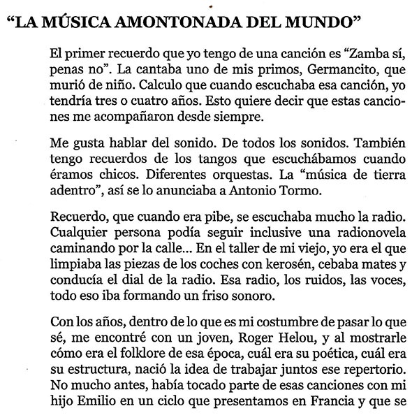 interpretado por los troesmas Juan Cedrón en guitarra y voz, Horacio Avilano en