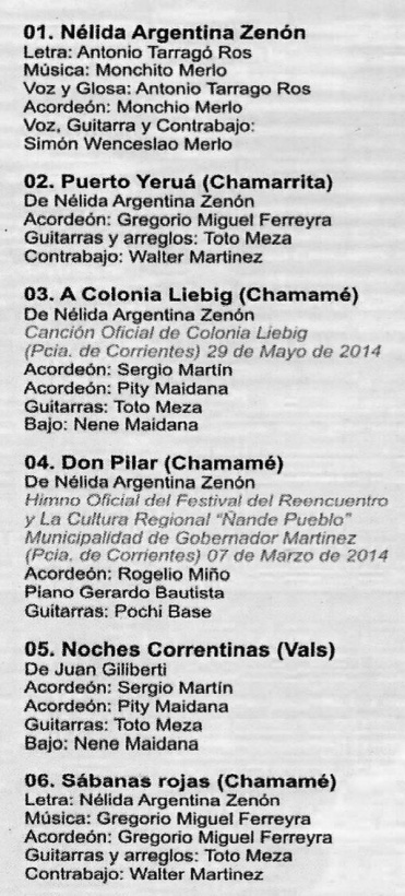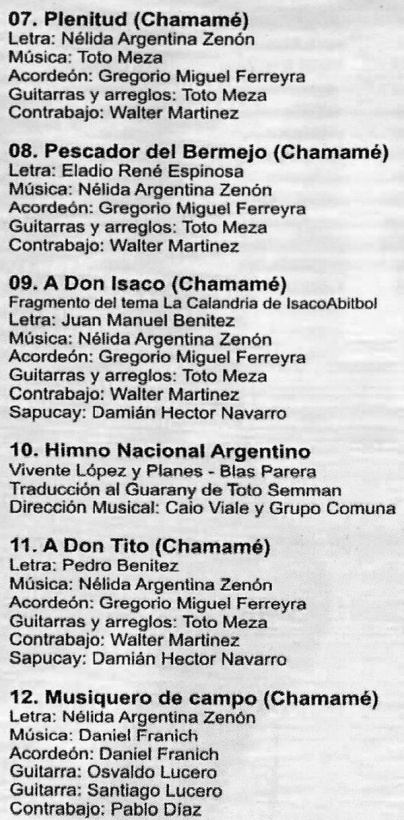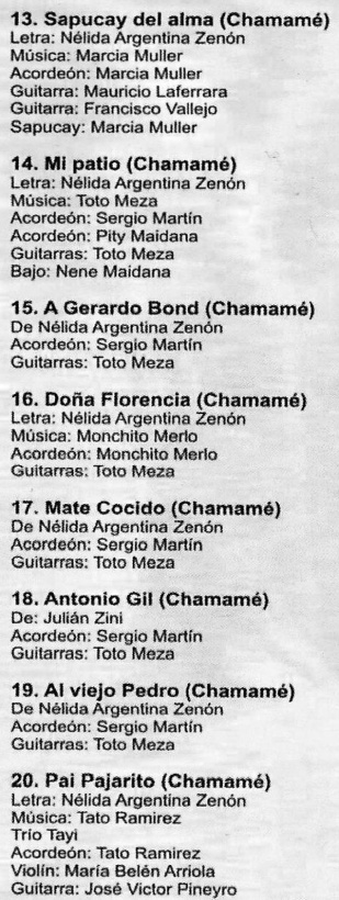 Zenón) y "Pai Pajarito" (chamamé, letra de Nélida Argentina Zenón y música de
