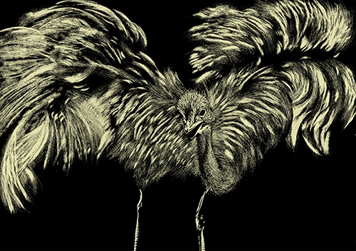 "Ñandú" xilografía de José Pedreros Prado. El ñandú nuestro no esconde la cabeza bajo la tierra como su pariente africano el avestruz. Cuando se lo ataca enfrenta la pelea.