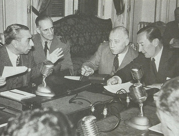 Reunión de gabinete en 1956: sobre el margen izquierdo el almirante Rojas y sobre el derecho el teniente general Pedro Eugenio Aramburu.