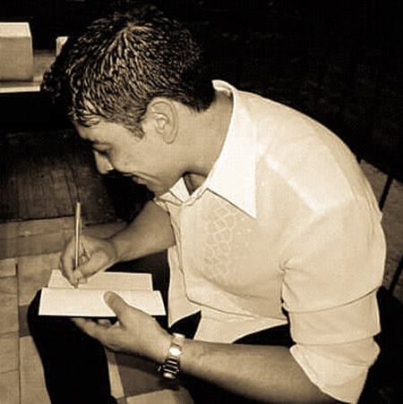 Lucio Albirosa, escribiendo entre los disparos que vienen de uno y otro lado (Foto: Susana Arenas)