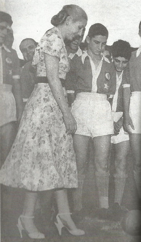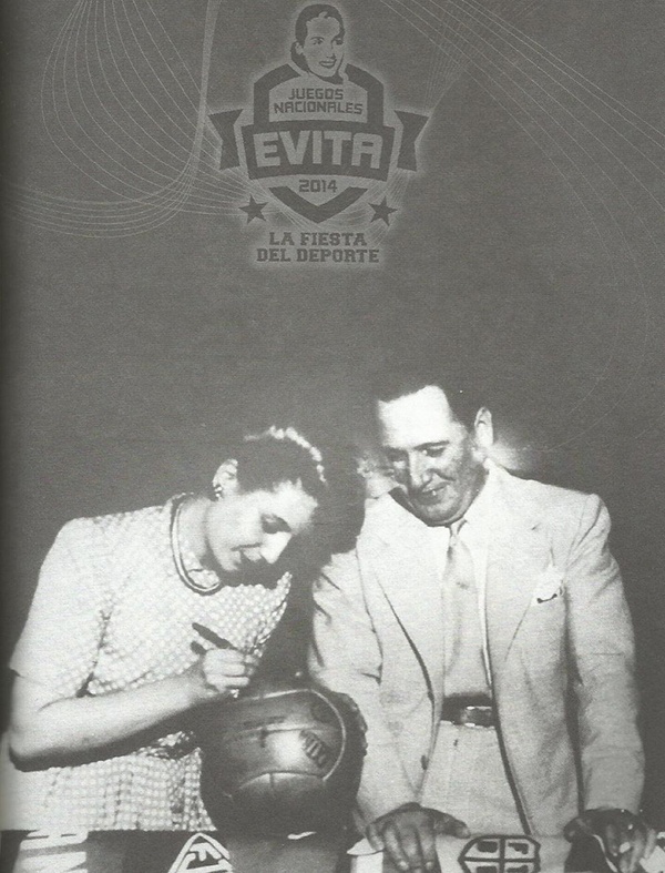 Evita le pone la firma a la pelota, con Perón de privilegiado testigo. Los juegos comenzaron en 1948 con un torneo de fútbol que incluyó a la Capital y al Gran Buenos Aires, y al año siguiente se convirtieron en los Juegos Nacionales Evita.