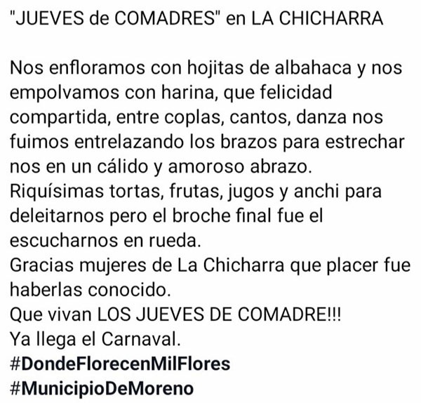 Comadres". En el Partido de Moreno, Gran Buenos Aires al oeste, habitado por