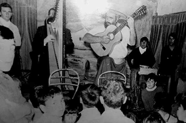Cafrune cantando en la Capilla Sagrada Familia en Villa Lynch- Patagones al otro dia de su arribo en el año 69. Tapado por el arpa, su ejecutante Aníbal Sampayo. (Foto del archivo de Miguel Albrecht)