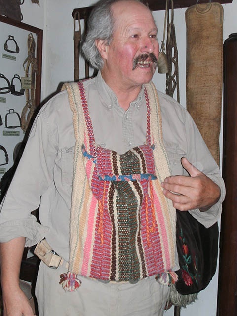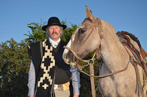 Hechenleitner en Patagones. Poncho tejido por él. Y su caballo emprendado también por él, tanto los cueros como los tejidos. (Foto: Claudia Goy).