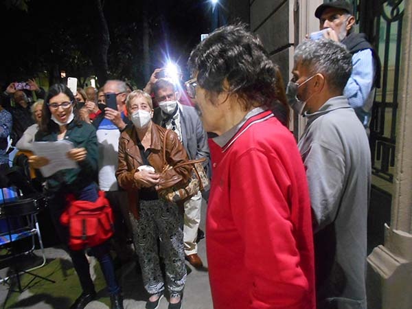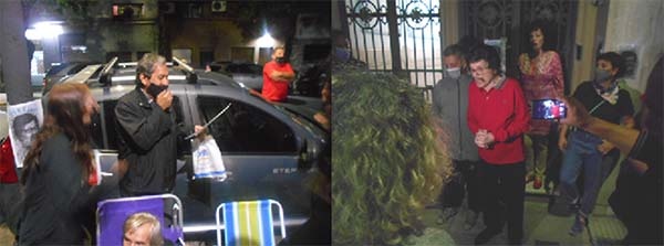 Mientras sostiene su barbijo, el músico, cantor y escritor chaqueño Rubén Tolosa (autor de "Mensajero de la Tierra Roja"-biografía de Ramón Ayala El Mensú") suma su voz recitando y Ramón Ayala agradece a quienes concurrimos a serenatearlo.