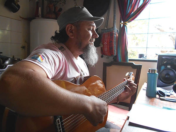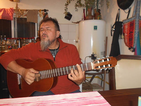 cantando y contando su historia en un pub, en un restaurante, en una peña o con