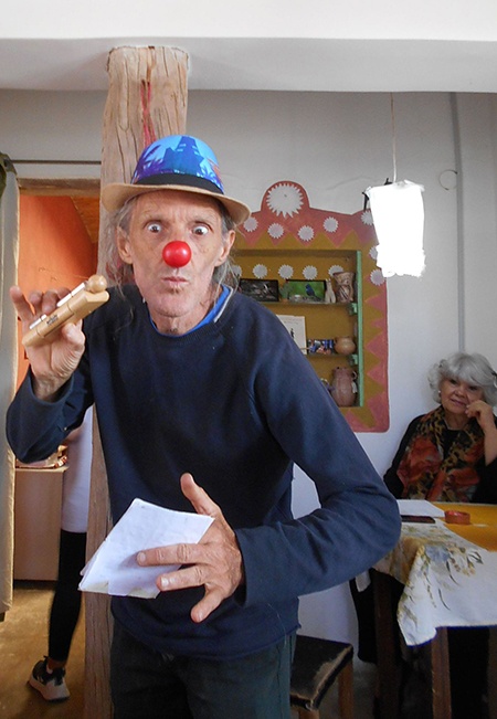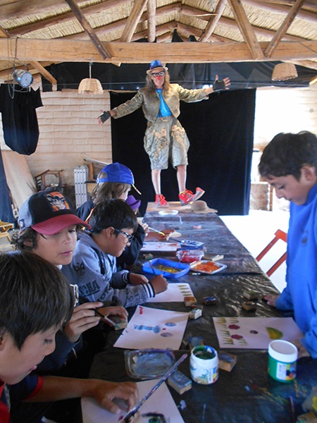 Taller de Sellos, pintura y retrato de payaso, a cargo de Julieta Ferrero y Pablo Sonzini. Sonzini controla a sus alumnos "desde las alturas de su cargo".