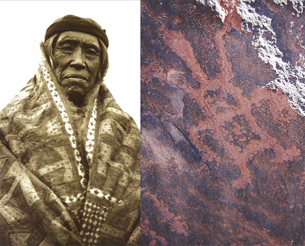Anciano tehuelche, fotografiado por Carlos Bruch en 1904. Publicada en "Tehuelches danza con fotos" de Osvaldo Mondelo y Foto de un petroglifo en Hualfin, Catamarca, tomada por Nicolás Bustos.