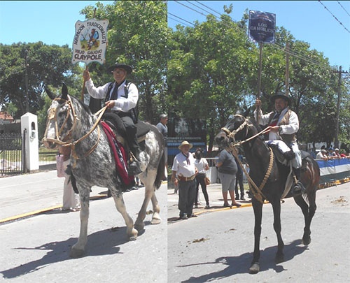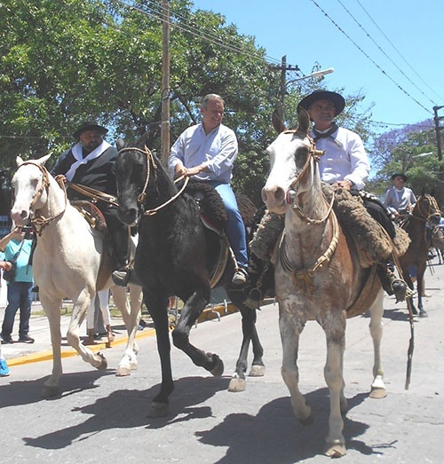 Nestor Olariaga, Federico Suigo, Chano Monzon, Diego Iodice y Cacho Cejas, "capataces" del desfile de instituciones tradicionalistas (participaron 15) solicitan permiso al Intendente Mariano Cascallares para iniciar el desfile de las quince instituciones que protagonizaron la fiesta en Ministro Rivadavia.
