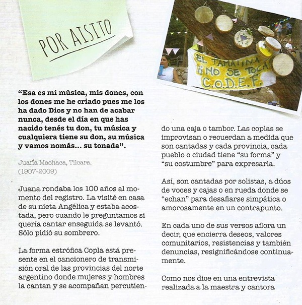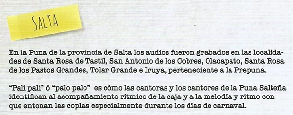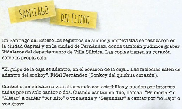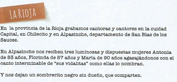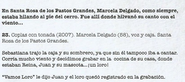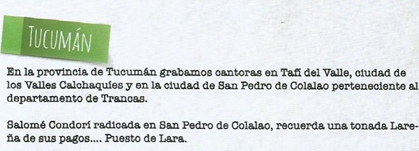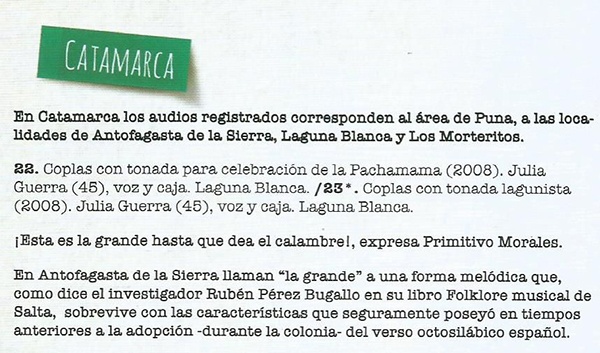 : A-Coplas con tonada de verano (2007). Juana Machaca (100 años), voz y caja. Tilcara. B-Coplas con tonada de carnaval (2007). Rosa Susana Flores (39 años), voz y caja. Quintin Carrillo (43 años), voz. Brígida Demetria Cruz (45 años), voz y caja. Santa Catalina. C-Coplas con tonada para la celebración de la Pachamama (2008). Lucio Cayo Guerra (42 años), voz y caja. Laguna Blanca. D-Vidalita (2009). Antonia Carrizo (83 años), voz y caja. Florinda Diaz (87 años), voz y caja. María Olivera de Villagra (90 años), voz y caja. Alpasinche, San Blas de los Sauces. E-La ausencia, vidala (2008). María Magdalena Ledesma (60 años), voz y caja. Fernández. F-Vidala, dúo (2008). Rubén Dalmacio Ledesma (80 años), voz y caja y Tito Orellana (58 años), voz y caja. Manogasta, Departamento de Villa Silípica.