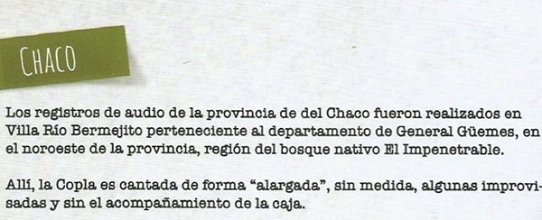 A-Coplas con tonada (2007). Marcela Delgado (58 años), voz y caja. Santa Rosa de los Pastos Grandes. B-Coplas con tonada (2007). Sebastiana Teófila Tolaba (71 años), voz y caja. Santa Rosa de los Pastos Grandes. C-Copla chaqueña (2009). Colacho Moreno (53 años), voz. Río Bermejito. D-Coplas chaqueñas (2009). Ercilia Moreno (50 años), voz. Río Bermejito. E-Coplas con tonada lareña (2008). Salomé Condori (55 años), voz y caja. San Pedro de Colalao.
