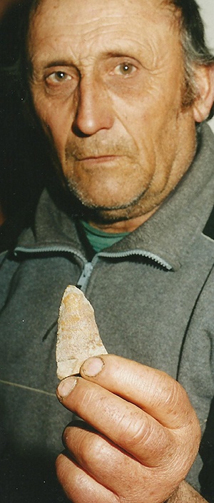 José Secco con una de las tantas puntas de flecha halladas por él (Foto Ricardo Acebal año 2002)